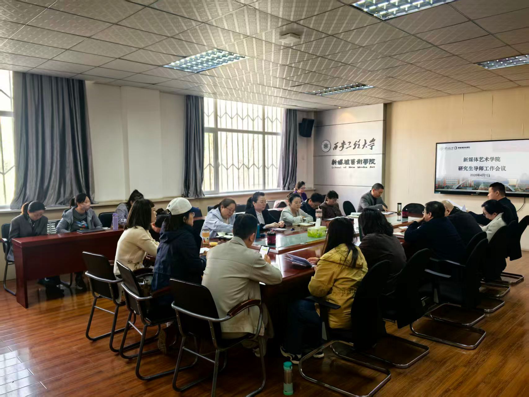 2026年4月1日上午,新媒体艺术学院在8-326会议室召开研究生导师工作会。学院党委书记张瑾、院长丛红艳、全体研究生导师参加会议,会议由主管研究生副院长王晨仰主持。