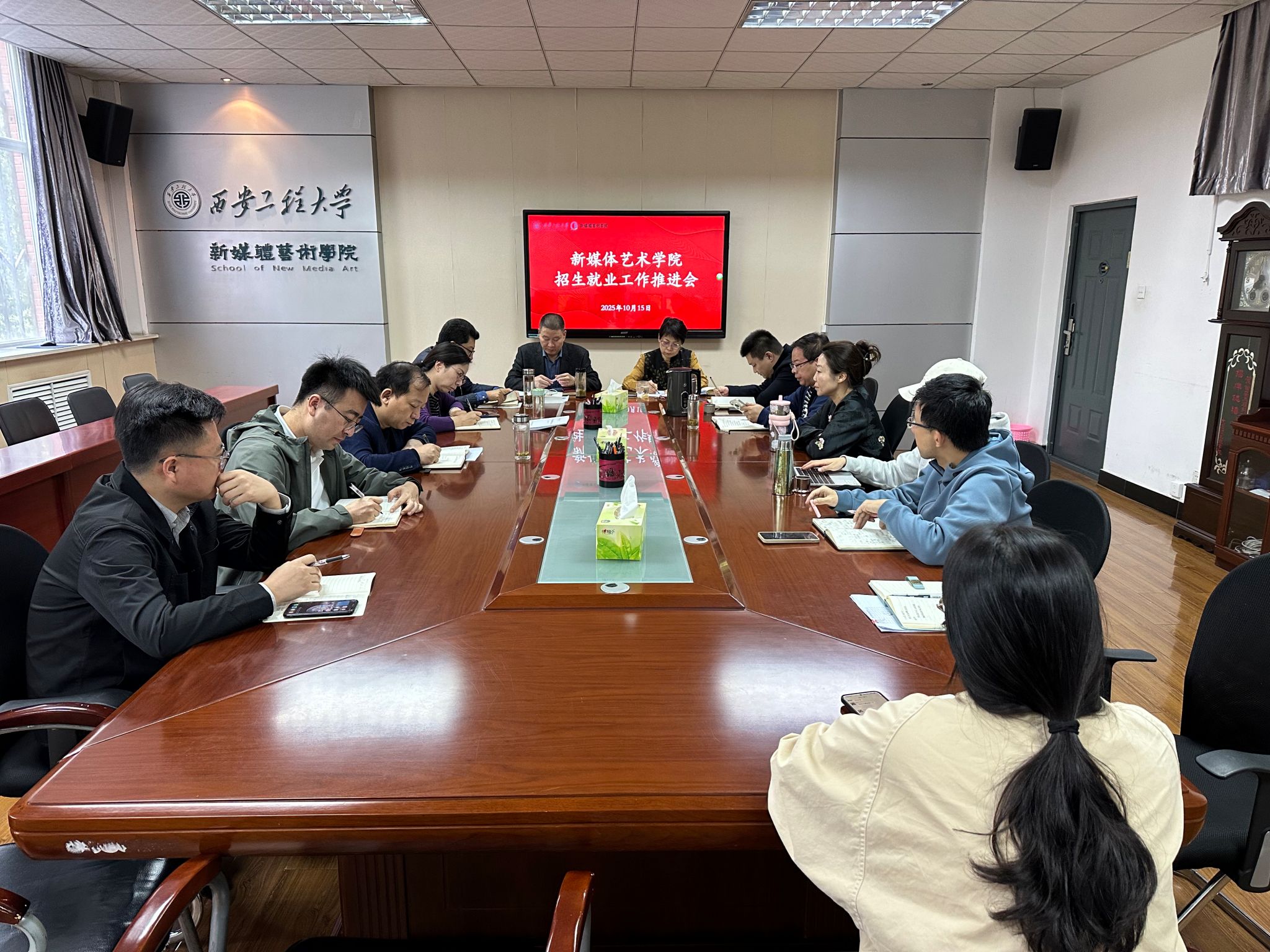 10月15日下午,新媒体艺术学院招生就业工作推进会在金花校区8号教学楼326会议室召开。学院领导班子成员、各系办主任、毕业班辅导员、研究生辅导员参加会议。会议由新媒体学院党委书记张瑾主持。