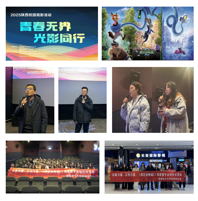 2025年11月26日下午,新媒体艺术学院组织本科生与研究生前往长安国际影城开展以"光影无界.青春同行"为主题的观影活动。学院党委副书记赵文熙、研究生辅导员薛少老师全程带队与同学们一同观看了备受期待的《疯狂动物城2》。影片结束后,两位老师也向同学们分享了他们的观影感受与寄语。
