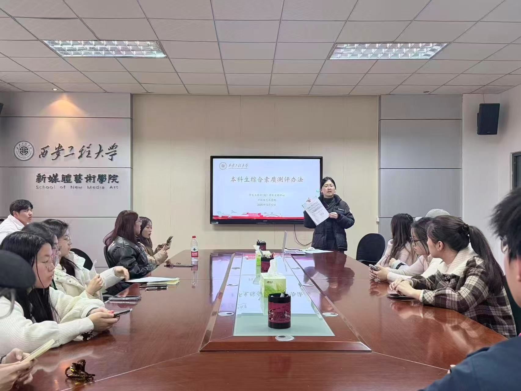 为全面落实立德树人根本任务,科学、公正地评价学生的综合素质,引导学生德智体美劳全面发展,2025年12月12日新媒体艺术学院于金花校区8号楼326会议室开展了《西安工程大学本科生综合素质测评办法》专题培训会。本次培训由学院资助辅导员宾田田老师主讲,学院2025级各班班长、团支书及学生会、学生社团组织骨干成员参加学习。