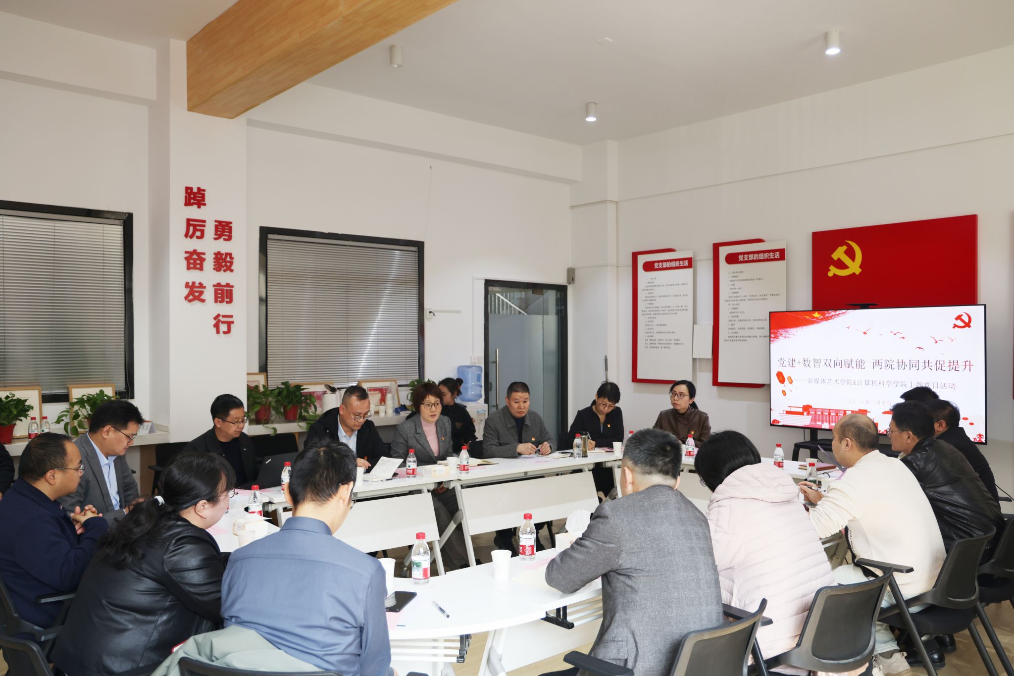 3月10日,新媒体艺术学院党委与计算机科学学院党委在金花校区联合开展“党建+数智双向赋能,两院协同共促提升”主题党日活动,校党委副书记、纪委书记、监察专员张美忠出席活动,两学院领导班子成员、专业负责人、相关科研团队成员及骨干教师等30余人参加活动,会议由新媒体艺术学院党委书记张瑾主持。