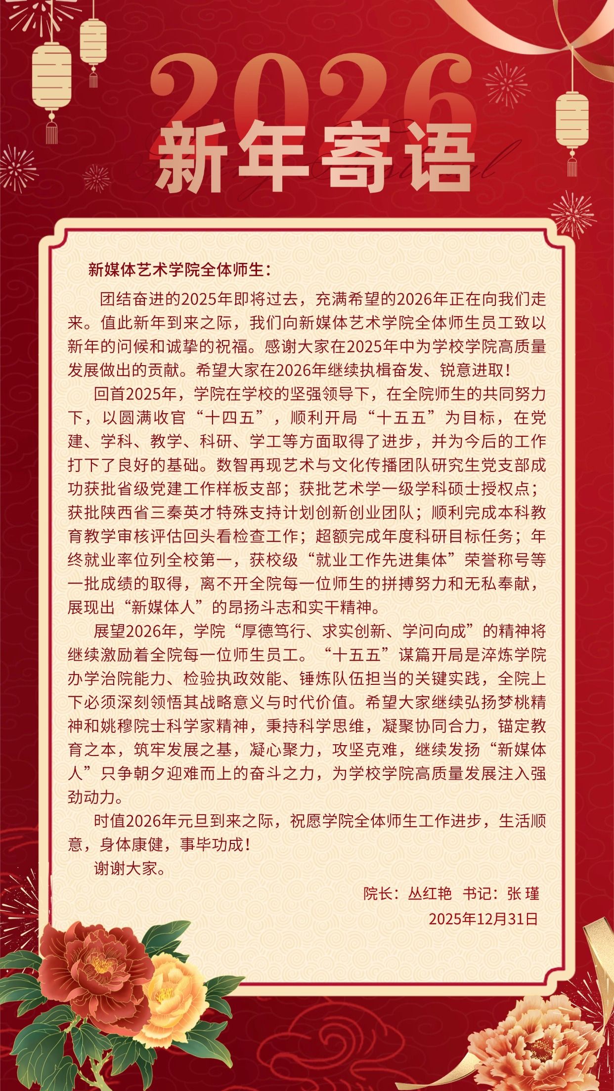 团结奋进的2025年即将过去,充满希望的2026年正在向我们走来。值此新年到来之际,我们向新媒体艺术学院全体师生员工致以新年的问候和诚挚的祝福。感谢大家在2025年中为学校学院高质量发展做出的贡献。希望大家在2026年继续执楫奋发、锐意进取!