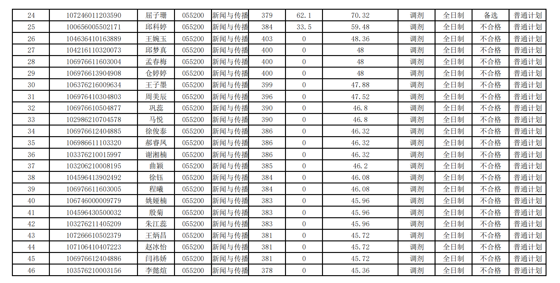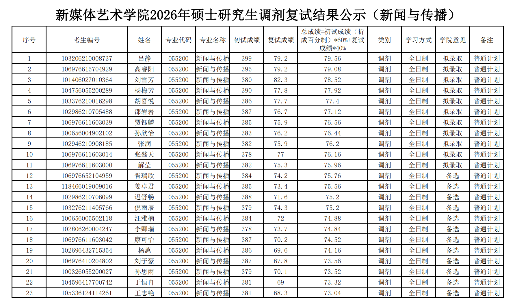 根据学校《关于做好我校2026年硕士研究生招生调剂复试录取工作的通知》及《新媒体艺术学院2026年硕士研究生调剂复试录取工作实施细则》,我院已完成2026年硕士研究生新闻与传播专业调剂复试工作。经学院研究生复试录取工作领导小组审核,现将拟录取考生名单予以公示,公示期3天。若有异议,请于公示期内实名向学院或学校研招办反映。